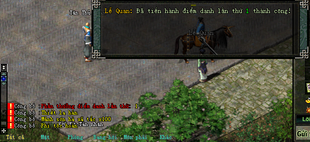 Mỗi ngày quý nhân sỹ chỉ có thể điểm danh 1 lần duy nhất, điểm danh thành công sẽ có thông báo trên kênh chát và vật phẩm tự động thêm vào hành trang người chơi
